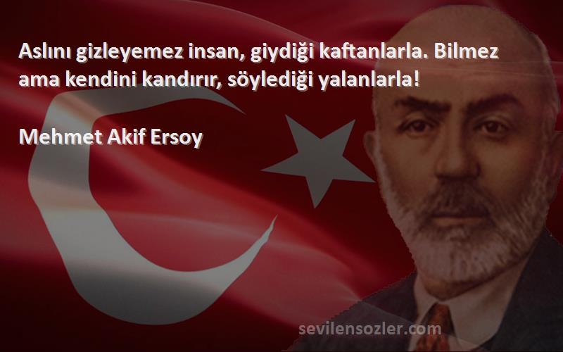 "Mehmet Akif Ersoy - Aslını gizleyemez insan, giydiği kaftanlarla. Bilmez ama kendini kandırır, söylediği yalanlarla!" hakkında yaptığınız yorumlar da hakeret içeren yada onur kırıcı cümleler olmamalıdır. Lütfen sanata saygı çerçevesinde yorum yapınız. Diğer tüm sözlerde olduğu gibi "Mehmet Akif Ersoy - Aslını gizleyemez insan, giydiği kaftanlarla. Bilmez ama kendini kandırır, söylediği yalanlarla!" Sözlerine atılan hiçbir hakaret, küfür, argo içeren yorum kabul etmeyecektir. Göstermiş olduğunuz hassasiyetin tüm sözler için geçerli olduğunu unutmayınız.