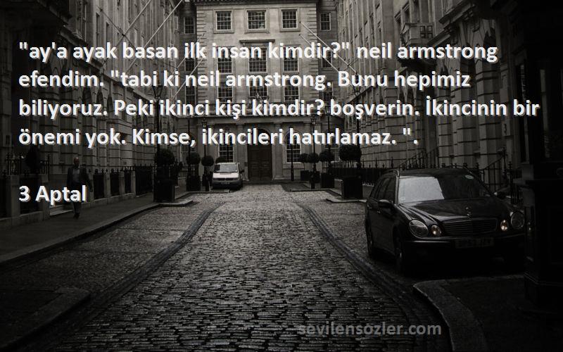 "3 Aptal - "ay'a ayak basan ilk insan kimdir?" neil armstrong efendim. "tabi ki neil armstrong. Bunu hepimiz biliyoruz. Peki ikinci kişi kimdir? boşverin. İkincinin bir önemi yok. Kimse, ikincileri hatırlamaz. "." hakkında yaptığınız yorumlar da hakeret içeren yada onur kırıcı cümleler olmamalıdır. Lütfen sanata saygı çerçevesinde yorum yapınız. Diğer tüm sözlerde olduğu gibi "3 Aptal - "ay'a ayak basan ilk insan kimdir?" neil armstrong efendim. "tabi ki neil armstrong. Bunu hepimiz biliyoruz. Peki ikinci kişi kimdir? boşverin. İkincinin bir önemi yok. Kimse, ikincileri hatırlamaz. "." Sözlerine atılan hiçbir hakaret, küfür, argo içeren yorum kabul etmeyecektir. Göstermiş olduğunuz hassasiyetin tüm sözler için geçerli olduğunu unutmayınız.