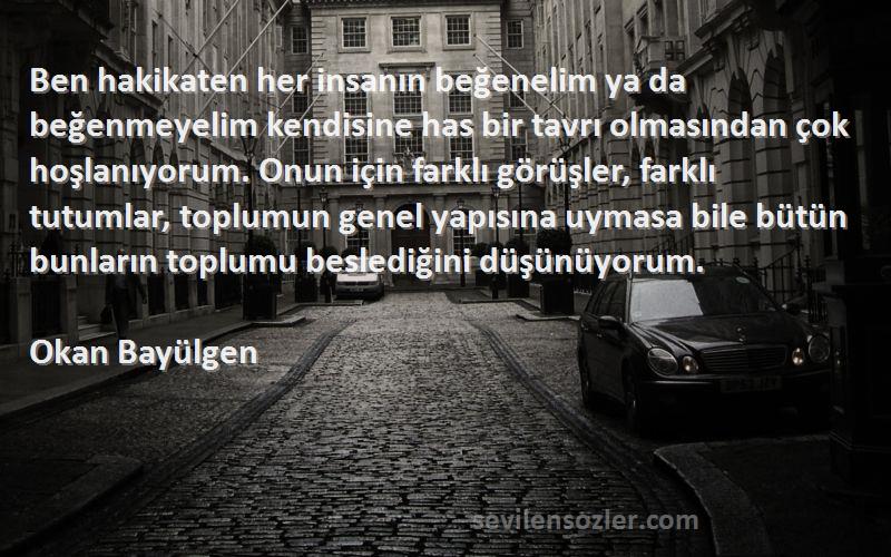 "Okan Bayülgen - Ben hakikaten her insanın beğenelim ya da beğenmeyelim kendisine has bir tavrı olmasından çok hoşlanıyorum. Onun için farklı görüşler, farklı tutumlar, toplumun genel yapısına uymasa bile bütün bunların toplumu beslediğini düşünüyorum." hakkında yaptığınız yorumlar da hakeret içeren yada onur kırıcı cümleler olmamalıdır. Lütfen sanata saygı çerçevesinde yorum yapınız. Diğer tüm sözlerde olduğu gibi "Okan Bayülgen - Ben hakikaten her insanın beğenelim ya da beğenmeyelim kendisine has bir tavrı olmasından çok hoşlanıyorum. Onun için farklı görüşler, farklı tutumlar, toplumun genel yapısına uymasa bile bütün bunların toplumu beslediğini düşünüyorum." Sözlerine atılan hiçbir hakaret, küfür, argo içeren yorum kabul etmeyecektir. Göstermiş olduğunuz hassasiyetin tüm sözler için geçerli olduğunu unutmayınız.