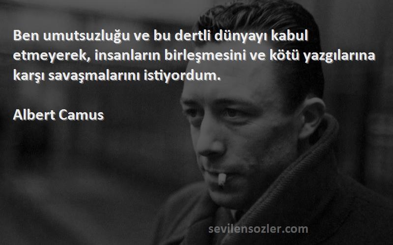 "Albert Camus - Ben umutsuzluğu ve bu dertli dünyayı kabul etmeyerek, insanların birleşmesini ve kötü yazgılarına karşı savaşmalarını istiyordum." hakkında yaptığınız yorumlar da hakeret içeren yada onur kırıcı cümleler olmamalıdır. Lütfen sanata saygı çerçevesinde yorum yapınız. Diğer tüm sözlerde olduğu gibi "Albert Camus - Ben umutsuzluğu ve bu dertli dünyayı kabul etmeyerek, insanların birleşmesini ve kötü yazgılarına karşı savaşmalarını istiyordum." Sözlerine atılan hiçbir hakaret, küfür, argo içeren yorum kabul etmeyecektir. Göstermiş olduğunuz hassasiyetin tüm sözler için geçerli olduğunu unutmayınız.