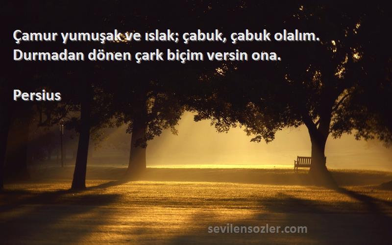 "Persius - Çamur yumuşak ve ıslak; çabuk, çabuk olalım. Durmadan dönen çark biçim versin ona." hakkında yaptığınız yorumlar da hakeret içeren yada onur kırıcı cümleler olmamalıdır. Lütfen sanata saygı çerçevesinde yorum yapınız. Diğer tüm sözlerde olduğu gibi "Persius - Çamur yumuşak ve ıslak; çabuk, çabuk olalım. Durmadan dönen çark biçim versin ona." Sözlerine atılan hiçbir hakaret, küfür, argo içeren yorum kabul etmeyecektir. Göstermiş olduğunuz hassasiyetin tüm sözler için geçerli olduğunu unutmayınız.