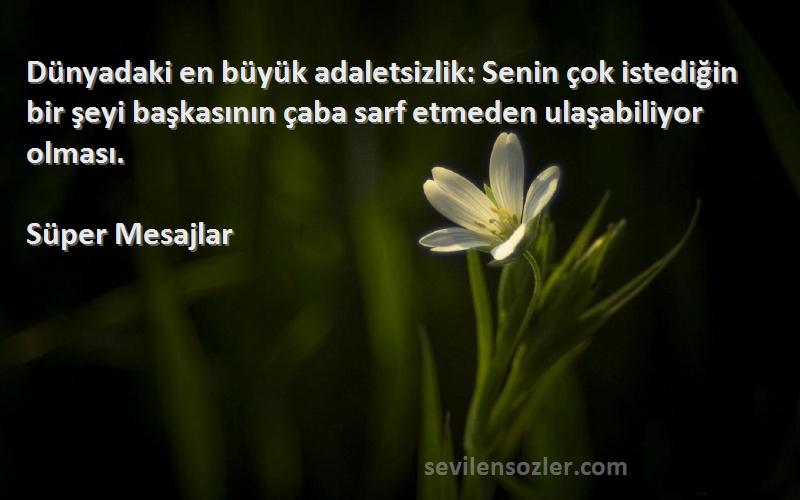 "Süper Mesajlar - Dünyadaki en büyük adaletsizlik: Senin çok istediğin bir şeyi başkasının çaba sarf etmeden ulaşabiliyor olması. " hakkında yaptığınız yorumlar da hakeret içeren yada onur kırıcı cümleler olmamalıdır. Lütfen sanata saygı çerçevesinde yorum yapınız. Diğer tüm sözlerde olduğu gibi "Süper Mesajlar - Dünyadaki en büyük adaletsizlik: Senin çok istediğin bir şeyi başkasının çaba sarf etmeden ulaşabiliyor olması. " Sözlerine atılan hiçbir hakaret, küfür, argo içeren yorum kabul etmeyecektir. Göstermiş olduğunuz hassasiyetin tüm sözler için geçerli olduğunu unutmayınız.