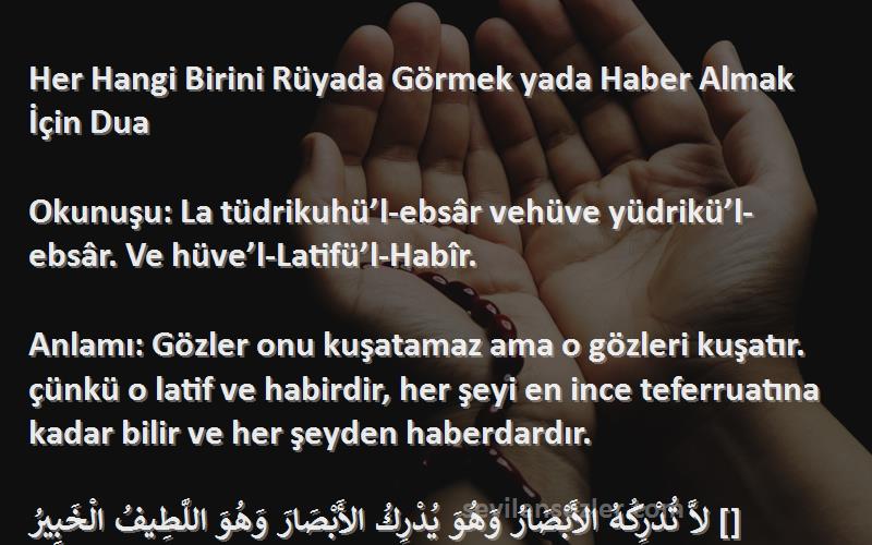 "Önerilen Dualar - Her Hangi Birini Rüyada Görmek yada Haber Almak İçin Dua Okunuşu: La tüdrikuhü’l-ebsâr vehüve yüdrikü’l-ebsâr. Ve hüve’l-Latifü’l-Habîr. Anlamı: Gözler onu kuşatamaz ama o gözleri kuşatır. çünkü o latif ve habirdir, her şeyi en ince teferruatına kadar bilir ve her şeyden haberdardır. لاَّ تُدْرِكُهُ الأَبْصَارُ وَهُوَ يُدْرِكُ الأَبْصَارَ وَهُوَ اللَّطِيفُ الْخَبِيرُ []" hakkında yaptığınız yorumlar da hakeret içeren yada onur kırıcı cümleler olmamalıdır. Lütfen sanata saygı çerçevesinde yorum yapınız. Diğer tüm sözlerde olduğu gibi "Önerilen Dualar - Her Hangi Birini Rüyada Görmek yada Haber Almak İçin Dua Okunuşu: La tüdrikuhü’l-ebsâr vehüve yüdrikü’l-ebsâr. Ve hüve’l-Latifü’l-Habîr. Anlamı: Gözler onu kuşatamaz ama o gözleri kuşatır. çünkü o latif ve habirdir, her şeyi en ince teferruatına kadar bilir ve her şeyden haberdardır. لاَّ تُدْرِكُهُ الأَبْصَارُ وَهُوَ يُدْرِكُ الأَبْصَارَ وَهُوَ اللَّطِيفُ الْخَبِيرُ []" Sözlerine atılan hiçbir hakaret, küfür, argo içeren yorum kabul etmeyecektir. Göstermiş olduğunuz hassasiyetin tüm sözler için geçerli olduğunu unutmayınız.