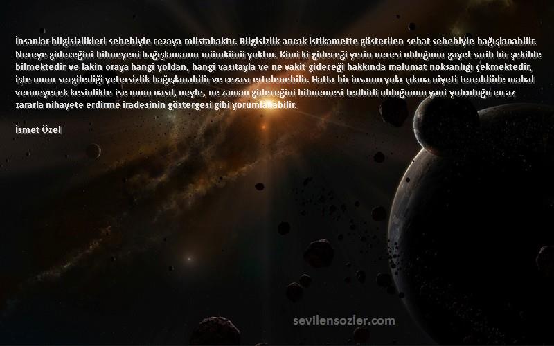 "İsmet Özel - İnsanlar bilgisizlikleri sebebiyle cezaya müstahaktır. Bilgisizlik ancak istikamette gösterilen sebat sebebiyle bağışlanabilir. Nereye gideceğini bilmeyeni bağışlamanın mümkünü yoktur. Kimi ki gideceği yerin neresi olduğunu gayet sarih bir şekilde bilmektedir ve lakin oraya hangi yoldan, hangi vasıtayla ve ne vakit gideceği hakkında malumat noksanlığı çekmektedir, işte onun sergilediği yetersizlik bağışlanabilir ve cezası ertelenebilir. Hatta bir insanın yola çıkma niyeti tereddüde mahal vermeyecek kesinlikte ise onun nasıl, neyle, ne zaman gideceğini bilmemesi tedbirli olduğunun yani yolculuğu en az zararla nihayete erdirme iradesinin göstergesi gibi yorumlanabilir." hakkında yaptığınız yorumlar da hakeret içeren yada onur kırıcı cümleler olmamalıdır. Lütfen sanata saygı çerçevesinde yorum yapınız. Diğer tüm sözlerde olduğu gibi "İsmet Özel - İnsanlar bilgisizlikleri sebebiyle cezaya müstahaktır. Bilgisizlik ancak istikamette gösterilen sebat sebebiyle bağışlanabilir. Nereye gideceğini bilmeyeni bağışlamanın mümkünü yoktur. Kimi ki gideceği yerin neresi olduğunu gayet sarih bir şekilde bilmektedir ve lakin oraya hangi yoldan, hangi vasıtayla ve ne vakit gideceği hakkında malumat noksanlığı çekmektedir, işte onun sergilediği yetersizlik bağışlanabilir ve cezası ertelenebilir. Hatta bir insanın yola çıkma niyeti tereddüde mahal vermeyecek kesinlikte ise onun nasıl, neyle, ne zaman gideceğini bilmemesi tedbirli olduğunun yani yolculuğu en az zararla nihayete erdirme iradesinin göstergesi gibi yorumlanabilir." Sözlerine atılan hiçbir hakaret, küfür, argo içeren yorum kabul etmeyecektir. Göstermiş olduğunuz hassasiyetin tüm sözler için geçerli olduğunu unutmayınız.