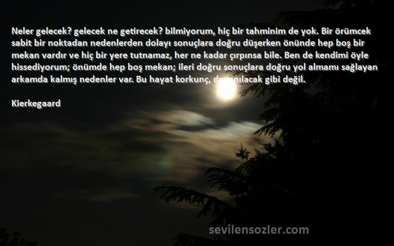 "Kierkegaard - Neler gelecek? gelecek ne getirecek? bilmiyorum, hiç bir tahminim de yok. Bir örümcek sabit bir noktadan nedenlerden dolayı sonuçlara doğru düşerken önünde hep boş bir mekan vardır ve hiç bir yere tutnamaz, her ne kadar çırpınsa bile. Ben de kendimi öyle hissediyorum; önümde hep boş mekan; ileri doğru sonuçlara doğru yol almamı sağlayan arkamda kalmış nedenler var. Bu hayat korkunç, dayanılacak gibi değil." hakkında yaptığınız yorumlar da hakeret içeren yada onur kırıcı cümleler olmamalıdır. Lütfen sanata saygı çerçevesinde yorum yapınız. Diğer tüm sözlerde olduğu gibi "Kierkegaard - Neler gelecek? gelecek ne getirecek? bilmiyorum, hiç bir tahminim de yok. Bir örümcek sabit bir noktadan nedenlerden dolayı sonuçlara doğru düşerken önünde hep boş bir mekan vardır ve hiç bir yere tutnamaz, her ne kadar çırpınsa bile. Ben de kendimi öyle hissediyorum; önümde hep boş mekan; ileri doğru sonuçlara doğru yol almamı sağlayan arkamda kalmış nedenler var. Bu hayat korkunç, dayanılacak gibi değil." Sözlerine atılan hiçbir hakaret, küfür, argo içeren yorum kabul etmeyecektir. Göstermiş olduğunuz hassasiyetin tüm sözler için geçerli olduğunu unutmayınız.